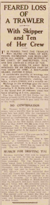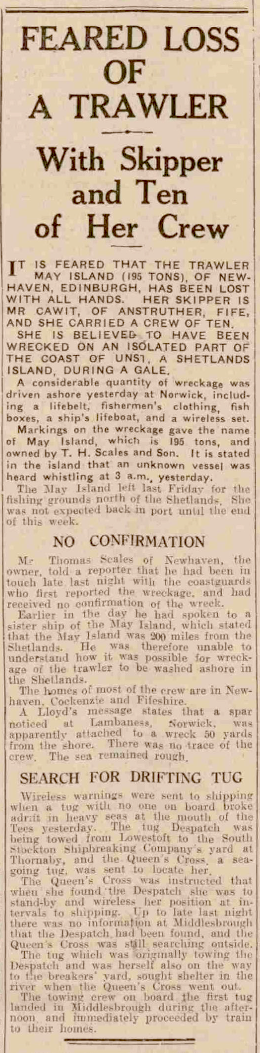 On 14th February 1936 the May Island departed from Granton harbour under the command of her usual skipper James Carvit. He had a crew of nine men aboard and was heading for the Icelandic fishing grounds. She disappeared en route in a violent storm with the loss of all of her crew and initially her fate was a mystery. However, on 18th February wreckage of a vessel was reported coming ashore at Lamba Ness, Norwick, Unst. Among the wreckage was a lifebuoy with the name ‘May Island’ and the trawler’s fate was apparent. Clearly the vessel had wrecked near this headland with the loss of everyone aboard. As people from the shore searched for survivors they spotted the ship’s mast protruding slightly above the surface of the boiling sea close to the edge of the rocks. On February 26th when the weather finally abated salvage agents who had arrived in the island were able to inspect the wreck which they reported lying on her starboard side at an angle of forty five degrees in 15 metres of water seventy yards from the shoreline. It was immediately obvious that successful salvage would be impossible.