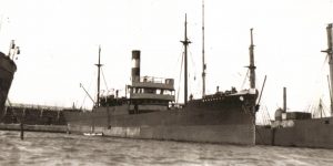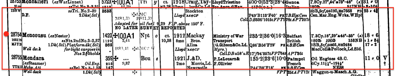 The steel steamship Nestor was launched from the yard of Mackay Brothers, Alloa (Yard No 17) on 12th July 1912. She measured 235.2′ x 36.0′ x 16.3′ and her tonnage was 1420 gross tons, 862 net tons. She was powered by a triple expansion steam engine by MacColl and Pollock Ltd., Sunderland delivering 158 nominal horse power. Built for Dampfs Ges, Bremen she was acquired by the French Government, presumably as a war prize, in 1919. Sold to the Societe Anon de Chargeurs de L’Ouest, Nantes in 1921 she was renamed Moncousu. In 1939 this company changed name to Cie Nantaise de Chargeurs de L’Ouest who were her registered owners when she was requisitioned by the Ministry of War Transport for war service under the management of George Gibson and Co Ltd of Belfast.