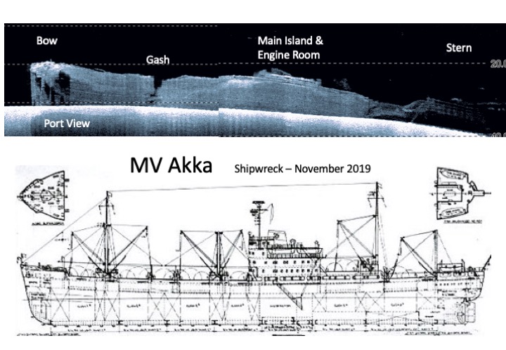 Recent sonar images of the wreck of the ore carrier Akka confirm dive reports that the wreck is beginning break up, after 63 years underwater off Dunoon in the Firth of Clyde. The scans confirm diver reports that the fore deck has dropped onto the cargo of iron ore in the holds, while the hull is beginning to fall out onto the seabed at various locations on both fore and aft decks.