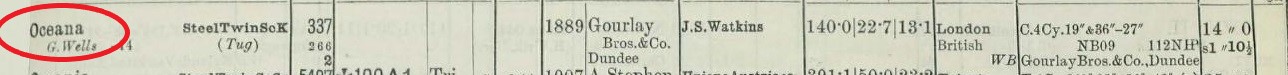 The steel steam tug Oceana was launched from the Dundee yard of Gourlay Brothers Ltd (Yard No 136) on 27th March 1889. She measured 140.0′ x 22.7′ x 13.1′ and her tonnage was 337 gross tons. She was powered by twin compound steam engines delivering 160 nominal horse power. She was built for William Watkins Ltd., London.