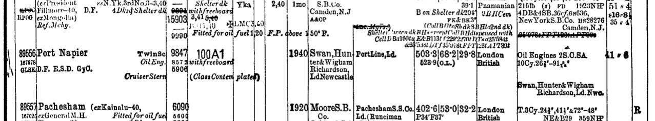 Launched from the yard of Swan Hunter Wigham Richardson of Newcastle (Yard No 1569) on 23rd April 1940 the steel motor vessel Port Napier measured 503.3′ x 68.2′ x 29.8′ and her tonnage was 9847 gross tons, 5906 net tons. Her twin 5 cylinder diesel engines were provided by William Doxford of Sunderland. She had been ordered by the Port Line of London as a refrigerated cargo ship but never sailed in the service of the company. She was requisitioned before fitting out had been completed and converted for service as a minelayer. The conversion included an almost complete re-layout of her deck structures, the fitting of 2 @ 4 inch guns, 2 @ 1.6 inch 2-pounder guns, 4 @ 20 mm guns and, most importantly, four minelaying doors were cut in her stern and narrow gauge rail lines installed in her holds to transport the mines to the doors. The sturdy ships of the Port Line made them ideal vessels for war service and, within a few months of the start of the war, most of them had been requisitioned by the Ministry of War Transport.
