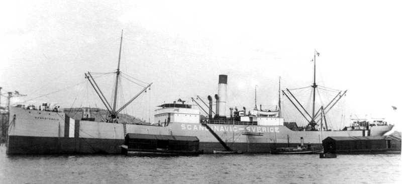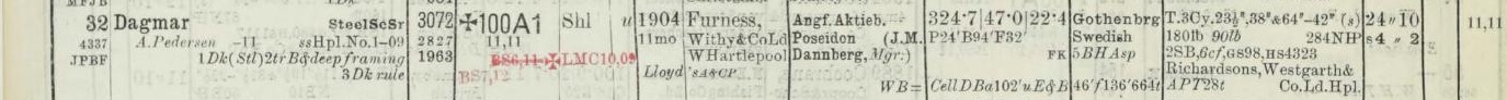 The steel steamship Dagmar was launched from the Middleton yard of Furness, Withy and Co Ltd (Yard No 275) on 7th June 1904. She measured 324.7′ x 46.9′ x 22.4′ and her tonnage was 3072 gross tons, 1963 net tons. She was powered by a triple expansion steam engine by Richardsons, Westgarth and Co Ltd delivering 284 nominal horse power. Ordered by A/B Poseidon (K O F Dalman), Gothenburg she operated from this Swedish port for her entire career. In 1916 she was sold to Fornyade Angfartygs A/B Viking Rederi A/B Transatlantic (G Carlsson) which was also based in Gothenburg and renamed Scandanavic.