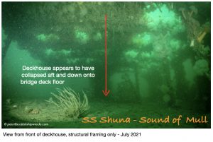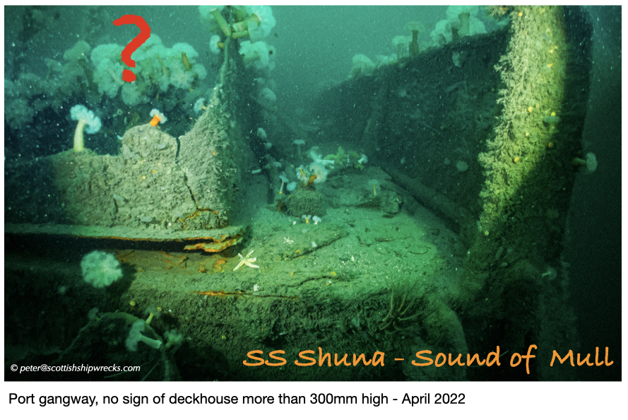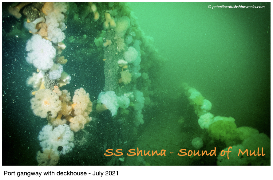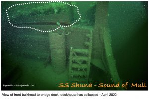 Just back from a few excellent days diving in the Sound of Mull, all I can say is it never disappoints, and the weather was kind to us with sun and light winds. One wreck I particularly like is the SS Shuna which lies around 9km west of Lochaline and is only 10-15 minutes boat ride from there. My first dive on the Shuna started as usual, down the shot to the engine room casing, decision left or right, let’s go to the bow. I swam across the boiler casing and then across a large winch where I stopped, something was not as I remembered it, there used to be a wall and structure here. Well at least there was in July 2021!