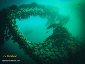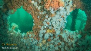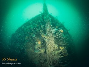 With the continued good weather on the West Coast, conditions for our dives were good, a light plankton bloom was in evidence but in general the visibility on the wrecks was 10-12m+, with a heavier bloom in Loch Sunart reducing visibility to around 4-5m. As you would expect the wrecks continue to degrade, for me this was most noticeable on the Rondo where little structure more than 2m above surrounding seabed remains. The Hispania seems to have settled further towards seabed level, there are cracks a corrugation in the port side, and the Shuna’s deck house and bridge is slowly loosing its external plating. That apart the wrecks are still very impressive and provide excellent subjects for trainee and experienced wreck divers, “lang may their lums reek”.