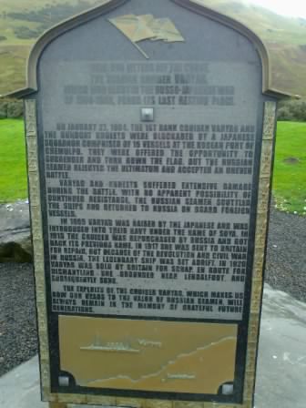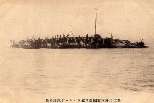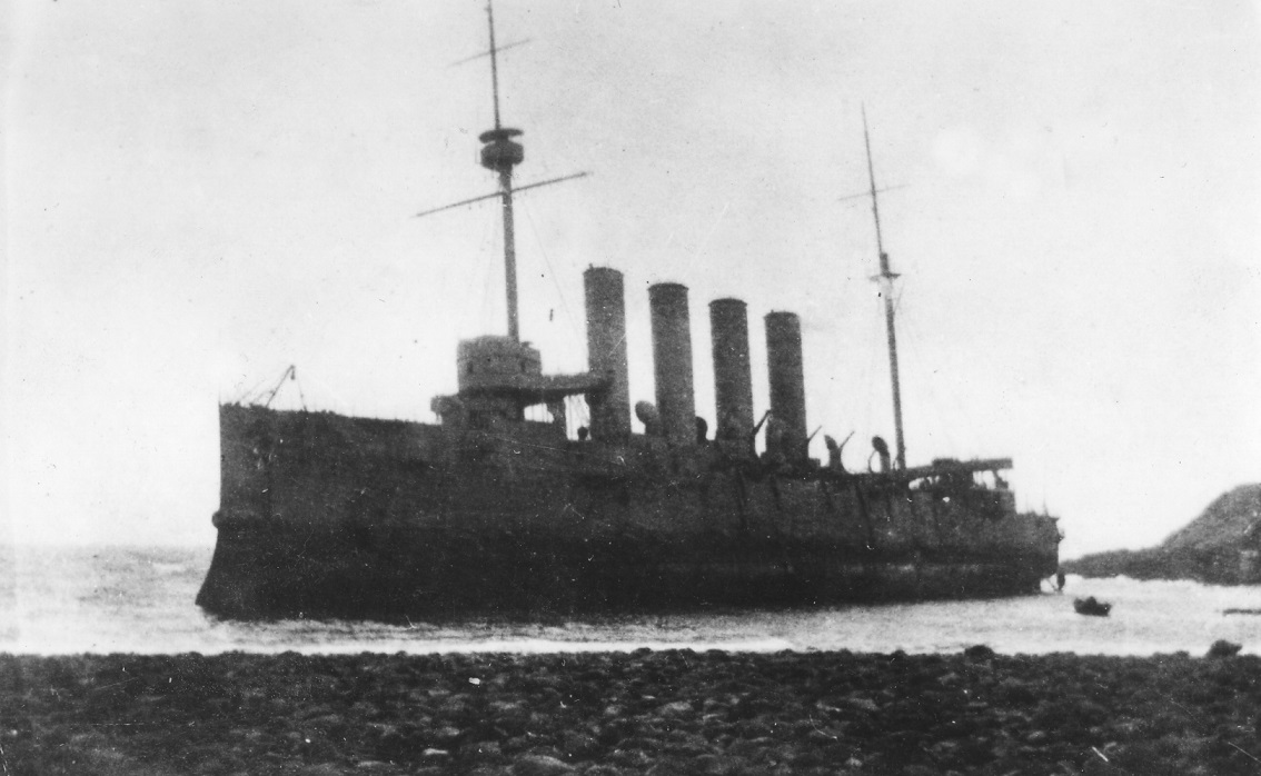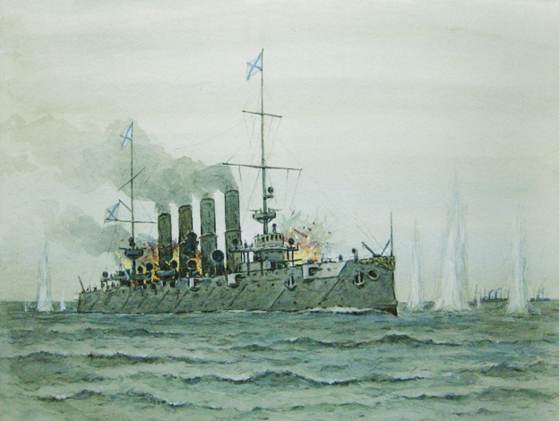 During the Battle of Chemupl’o Bay at the start of the Russo-Japanese war, Varyag (now under the command of Captain of the First Rank Vsevolod Rudnev) engaged in unequal battle with the Japanese squadron of Admiral Uriu (one armoured cruiser, five protected cruisers and eight destroyers) in a heroic attempt to break out from Chemulp’o (Incheon)) harbour February 9th, 1904. Chempulp’o was in neutral Korean waters. Admiral Uriu gave the Russian ships in harbour a written ultimatum to sail by 12:00 noon or be attacked in the harbour itself. Captain Rudnev sortied, accompanied by the gunboat Koreets but, having lost 31 men dead, 191 injured (out of 570) outgunned, both ships returned to harbour by 1:00 p.m. The crew decided not to surrender but to scuttle the ship. The crew were saved by transferring them to the British cruiser Talbot, the French cruiser Pascal, and the Italian cruiser Elba. The captain of the American cruiser Vicksburg declined doing so as a violation of U.S. neutrality.
