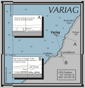 The scattered remains of the Varyag lie at the north end of Lendalfoot Bay about 400 metres offshore in approximate position 55° 10.925’N, 004° 56.103’W. The wreckage, which consists mainly of a few hull plates and a few structural members, lies on a flat rock and sand seabed. Debris extends over an area around 2000 square metres in depths of 6 to 10 metres. The wreck only rises one or two metres from the seabed. The site is exposed to the prevailing westerly wind and, as such, swell is the major potential problem.